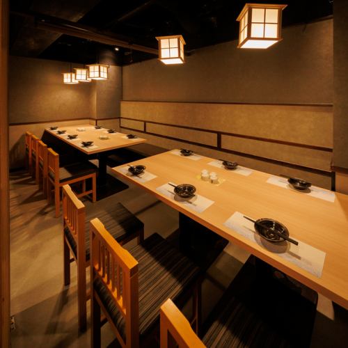 長時間でも快適に過ごせる14名様向け個室。上品な和の質感でまとめられ、個室ならではの静けさとプライベート感を確保。会社宴会や仲間内での集まり、歓送迎会にも最適な、ゆとりある個室です。