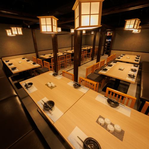 最大46名様までの広々とした宴会個室。柱と梁を活かした和モダンなレイアウトは、大人数でも視線が繋がりやすく一体感のある空間。歓送迎会、会社の決起会、同窓会など大規模な集まりに最適です。